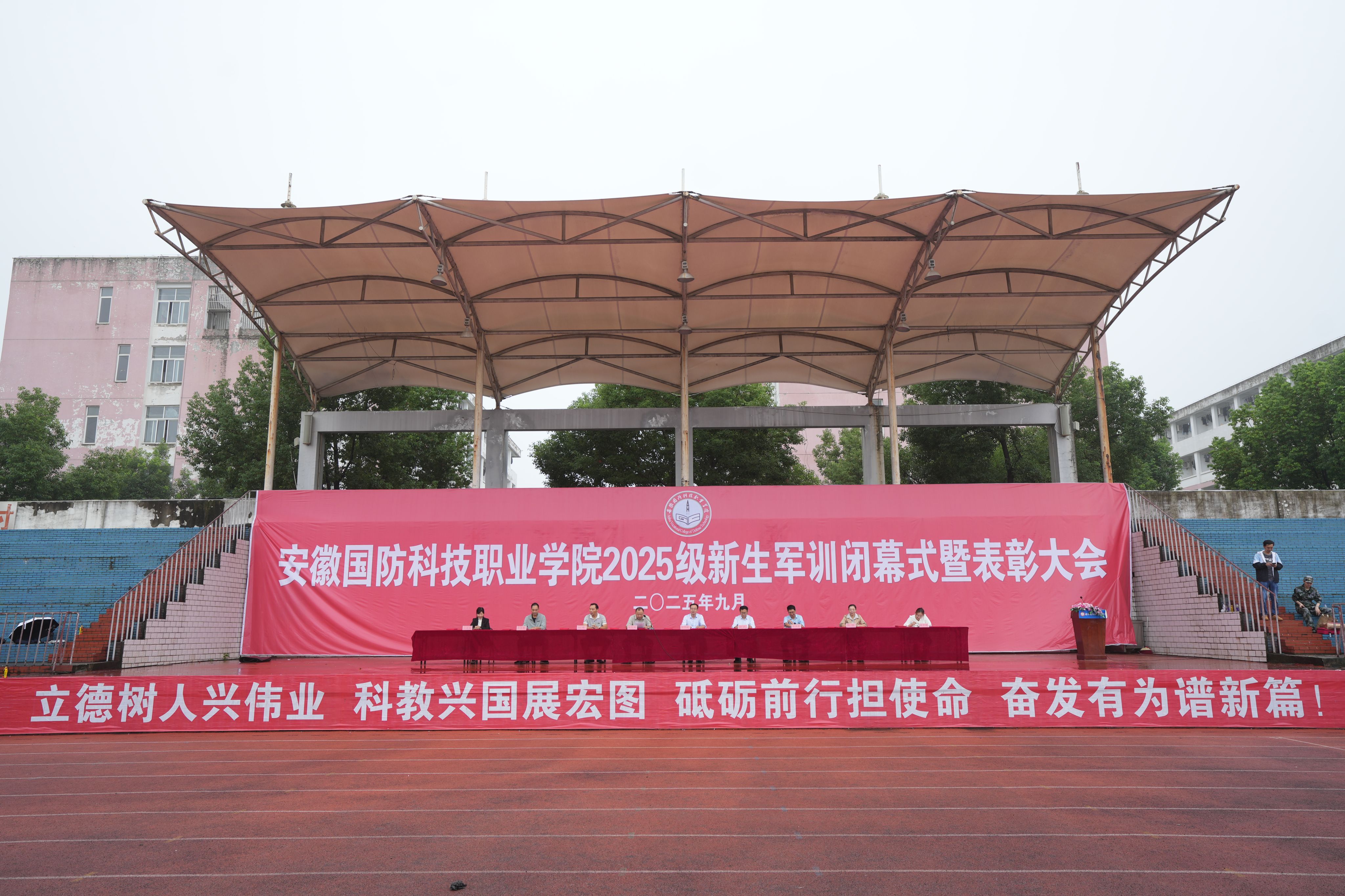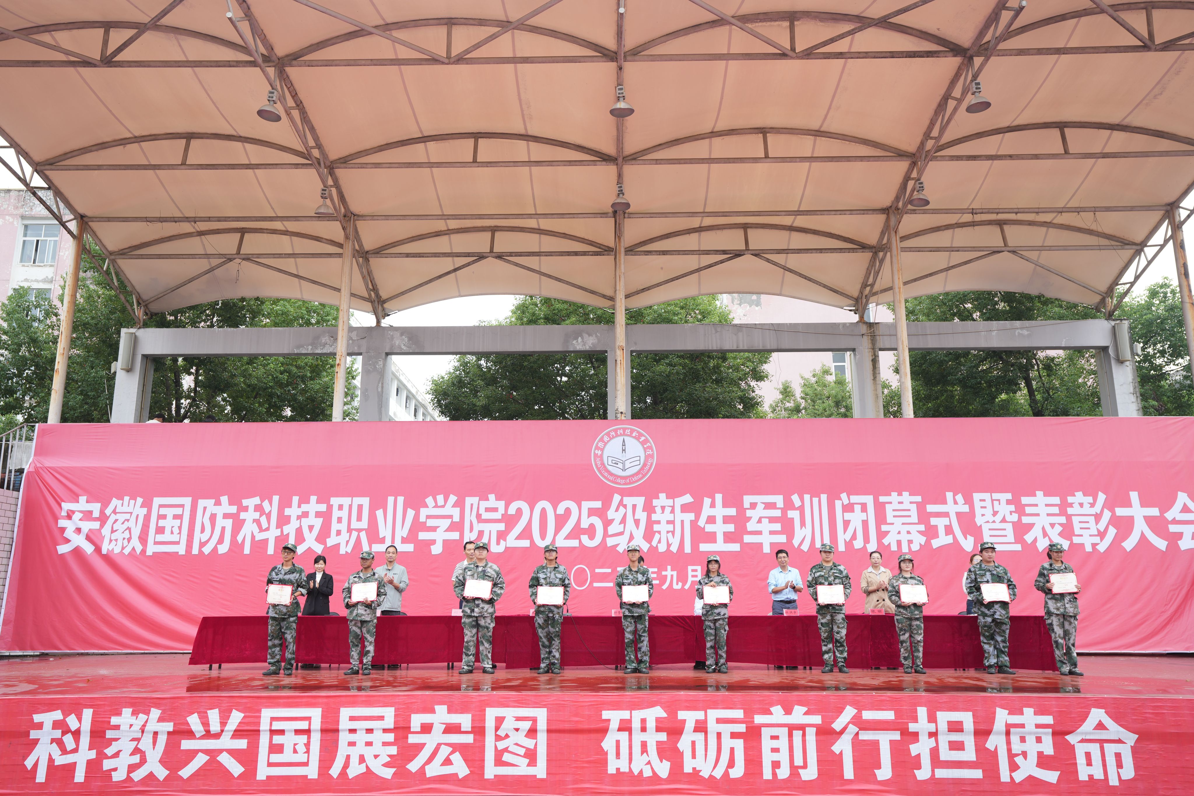 汇报表演结束后,张志鸿宣读了《关于表彰2025级学生军训先进集体和优秀训练标兵的决定》。大会对在军训中表现突出的“军训优秀中队”、“战场医疗救护科目评比先进个人”、“优秀训练标兵”及“内务卫生优秀宿舍”进行了表彰。校领导为获奖集体和个人代表颁奖。